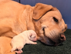 Topáz szerda este nyolc egészséges kiskutyát hozott a világra – de a nap még tartogatott egy igazi csodát! Órákkal később megszületett a kilencedik apróság, egy sárga kislány, aki fele akkora, mint a testvérei, és valóságos csoda, hogy él és egészséges.