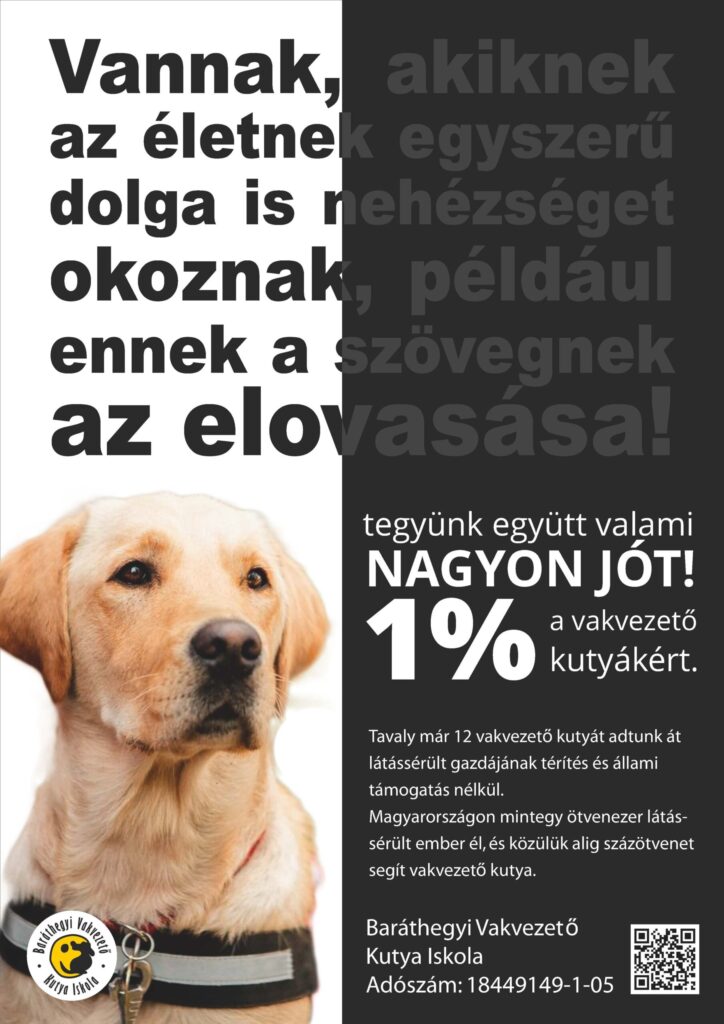 20 éve alapítottuk vakvezetőkutya-iskolánkat, annak érdekében, hogy minél több látássérült embernek adhassunk hű társat. Minden 1%-os támogatás sokat jelent, hiszen a Magyarországon a látássérült emberek alig 1%-át segíti vakvezető kutya, pedig a vakoknak és gyengén látóknak nagyobb segítséget jelentenek a mindennapokban, mint bármelyik élettelen segédeszköz.
