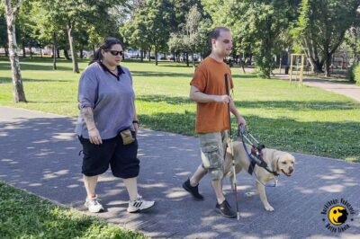 - Maxi fehér bottal közlekedik, sosem volt kutyája, ezért neki minden ismeret új arról, hogyan tudna együttműködni egy vakvezető kutyával. Darinka elmondta neki, hogy sok időt adunk az összeszokásra, és közben megtanítjuk a klienseinknek, hogyan reagáljanak a kutya jelzéseire, hogy jól alkalmazzák a parancsszavakat, közlekedési szituációkat gyakorolnak, útvonalakat tanulnak meg, de persze ezt a sort hosszan folytathatnánk még.