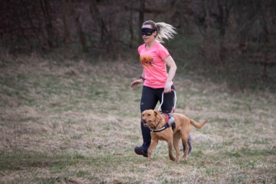 Királyné Barkóczi Emese letakart szemmel fut terepen a kutyájával