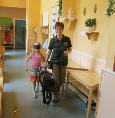 Nyíriné Kovács Mária élménybeszámolója a Budavári Kolping Katolikus Óvodában tett látogatásról: Június 5-én érzékenyítő foglalkozást tartottunk a Budavári Kolping Katolikus Óvodában, ahol a gyerekek óriási izgalommal vártak minket. Feszült figyelemmel figyelték, amikor a vakvezető kutyák munkájáról beszélgettünk, majd hosszú sorokba állva át is élhették hogyan is közlekedik egy vak ember, amit a szemük bekötésével érzékeltettünk. A bekötött szemű gyerekeket Tex, az Alapítvány kiképzés alatt álló kutyája vezette végig a folyosón, vigyázva apró lépteiket.