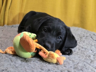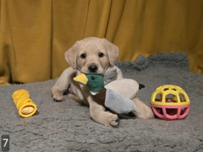 Topáz 7 hetes kölykei már 5 kilósak, a pici igyekszik, de azért alaposan le van maradva, még csak a fele a nagy tesóknak. A csapat egységes, vagyis mind a nyolcan nagyok és egészségesek, és sok más tekintetben is; például apportosak, hozzák viszik a plüssöket, ami később jól fog jönni, amikor a látássérült gazdi elejt valamit, ők pedig boldogan segíteni fognak. Szeretik a huzogatós játékot, az alagutat, mozgó libikókát és hintát. Már nem szopnak, lassan áttérnek a baba tápról a juniorra.