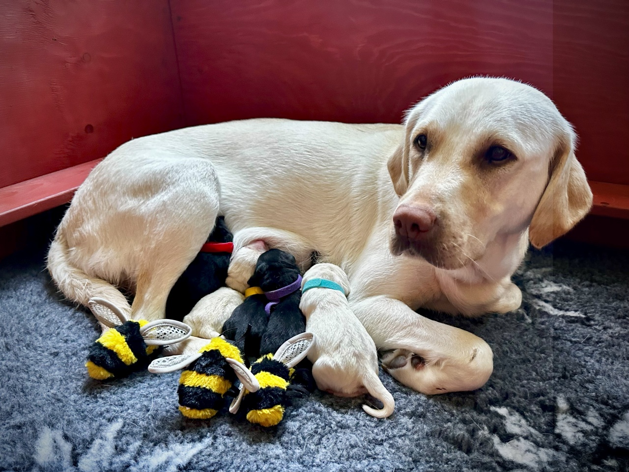 Teljes a csapat, Darázs öt gyönyörű kölyöknek adott életet a mai napon. Mindenki jól van, a kicsik szépen esznek és alszanak, anyakutyánk pedig gondoskodik róluk. Mindannyian kan kutyusok lettek, ketten sárgák, hárman pedig feketék.