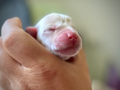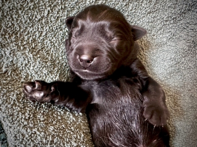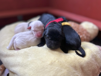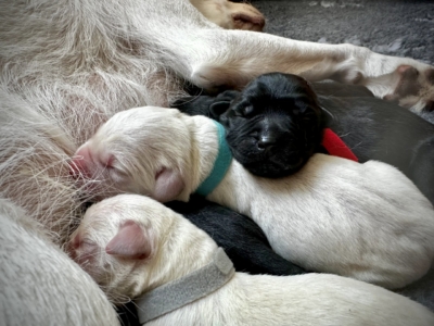 A kölykök apja, Elba fekete színű kutya, ezért van a kölykök között fekete bundájú is. Darázs első almában a legkisebb kölyök 200 gramm, a legnagyobb 410, ami szintén rendben van. Mindenki szép nagyra fog nőni.