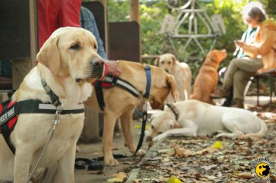 Indifference to food is a difficult task for a dog, but a guidedog must learn it at an early age in order for his visually impaired owner to enter friend and family gatherings, a canteen or restaurant near his workplace with complete peace of mind. Their good behavior is once again praised, and a delicious bite of their food is given as a reward.