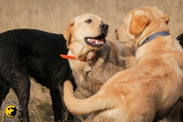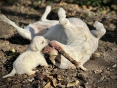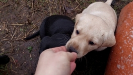 Tökéletes gyermekkora van a jövő vakvezető kutyáinak! Topáz kölykei ezen a héten töltötték be az öthetes kort, és nemcsak hogy gyorsan meghódították az őszi kertet, de már kint alszanak éjszaka is. Amikor meglátogattuk őket, éppen a harmatos levelek között játszottak és közben el-eltűntek egy hatalmas alagútban.